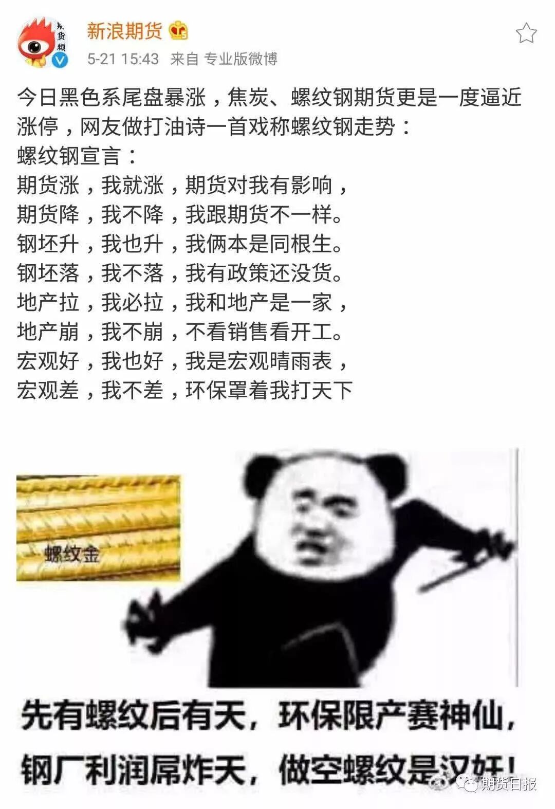 昨日,黑色系霸屏,焦炭(2305, 85.00, 3.83%)、螺纹钢(3891, 46.00,1.20%)期货更是一度逼近涨停。有网友作了一首打油诗形容螺纹钢的走势:
