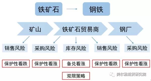 而处于中间环节的铁矿贸易商,会面临采购、库存和销售三大环节的不同风险。对于现货常备库存,可以买入看跌期权,也可以卖出看涨期权,或者两个策略同时使用,价格上涨时赚取额外收益,价格下跌时弥补库存减值,锁定销售收入。针对铁矿石产业链的上下游,可以选取合适的期权策略,如下图所示: