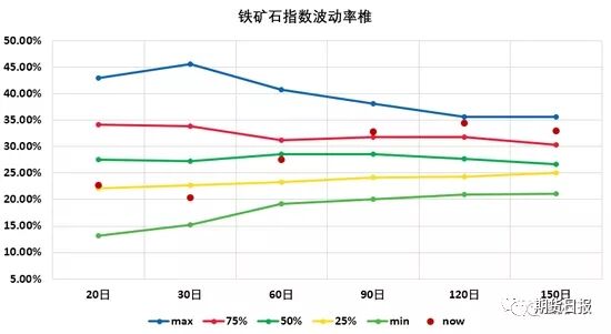 结合历史波动率的分布及铁矿石波动率椎来看,20日及30日历史波动率处于均值水平以下;当前90日历史波动率略高于均值水平,处于75%分位数附近,受当前市场行情及短时间窗口历史波动率影响,90日历史波动率未来走低概率较大。