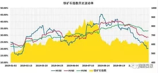 波动率是期权价格的重要影响因素,从期权定价的角度来看,波动率越高,则期权价格越大。下图是铁矿石期货2019年以来,铁矿石期货指数的历史波动率曲线。