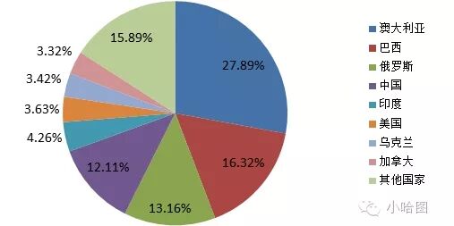 铁矿石在自然界中的储量比较丰富,在世界范围内的分布较广。全球铁矿石储量主要集中在澳大利亚、巴西、俄罗斯和中国,四国储量之和占世界总储量的近70%。