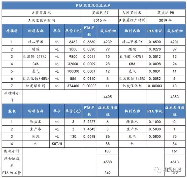 PTA新装置应用最新技术,因此PTA新装置市场成本最低。以英威达技术为例,当前英威达P8代表了PTA生产企业的最高技术,优于英威达P7技术。具体细节如表3所示,某PTA企业在2015年和2019年分别使用英威达P7和P8技术投产了两套PTA装置。从PTA单耗数据看,2019年投产并采用英威达P8技术的PTA装置在主要原料PX单耗上仅为0.65,相比英威达P7技术0.656能有效节省原料。除此之外,按现有市价,应用P8技术的PTA装置在辅料和动力的单耗仅为312元/吨的水平,优于P7技术349元/吨。根据目前所知的情况看,最低的现金流成本或在4500元/吨附近。