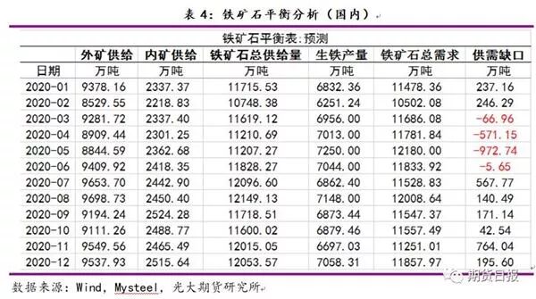 结合矿山发运和复产计划分析,推导铁矿石平衡表。可以看出,国内铁矿石综合库存(港口+钢厂)在2020年一季度处于累库状态,而二季度综合库存处于降库状态,且下降幅度明显,三季度和四季度重新进入累库状态。由上可知,2020年铁矿石价格高点或在二季度出现。