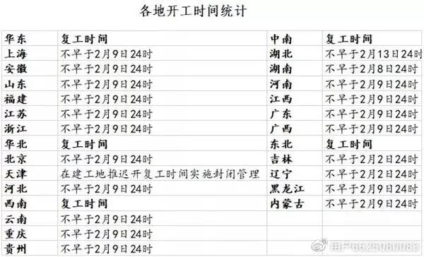 据光大期货统计数据,国内绝大多数省市已发布通知,推迟建筑工地等各类企业复工时间,多数省市复工时间不早于2月9日24时,最晚的是太原市,全省各类企业复工不早于3月1日24时。
