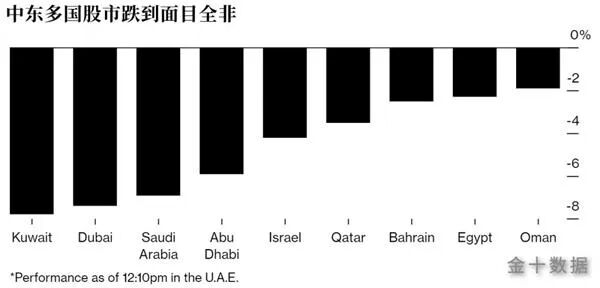 同时,沙特及周边国家股指跌幅不断扩大,盘中沙特TASI指数跌7.38%,沙特迪拜DFM指数跌7.47%,阿布扎比ADX指数跌5.78%,开罗EGX30指数、多哈股指均跌逾3%。以色列基准指数下跌4.8%,为14个月来最大跌幅。科威特股市下跌10%后暂停交易。